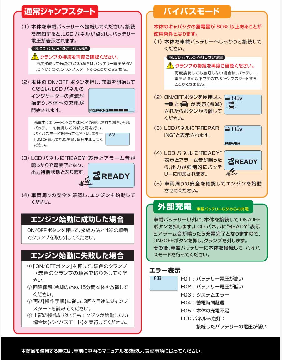 ジャンプスタート使用範囲:ガソリン車5,000ccクラス・ディーゼル車3,000ccクラス