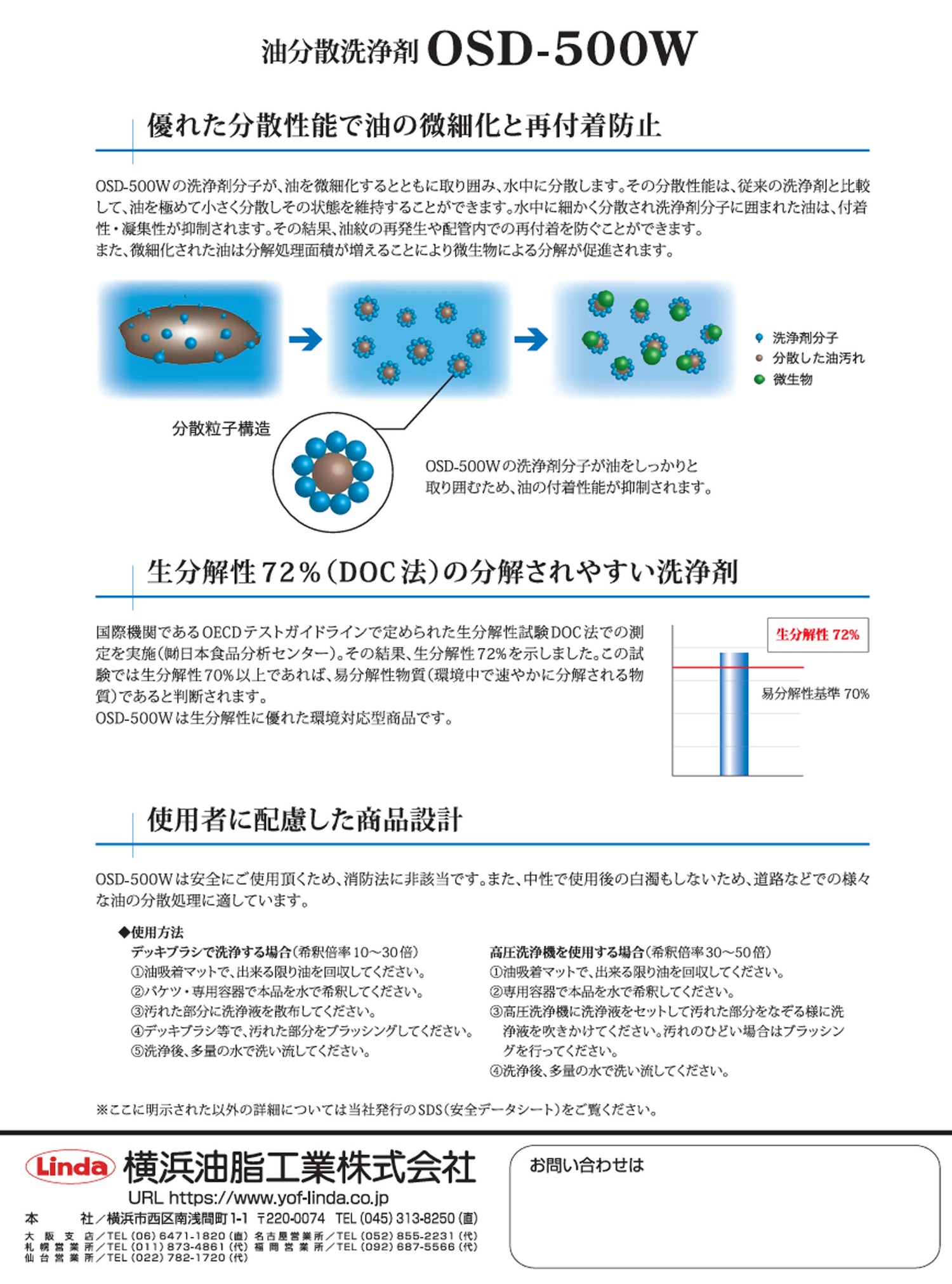 OSD-500Wは、優れた分散性能と、高い生分解性能を併せ持つ、洗浄効果と環境への配慮を両立した洗浄剤です。