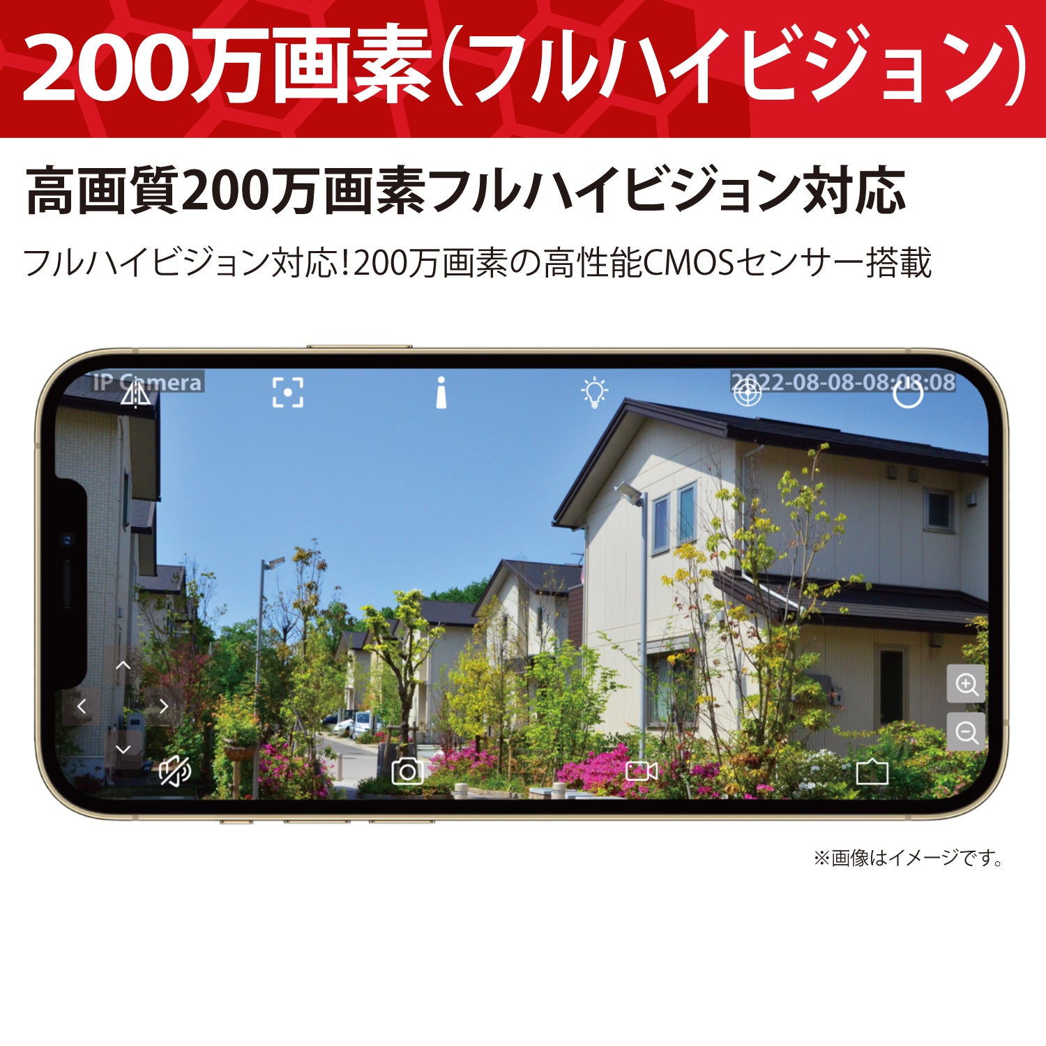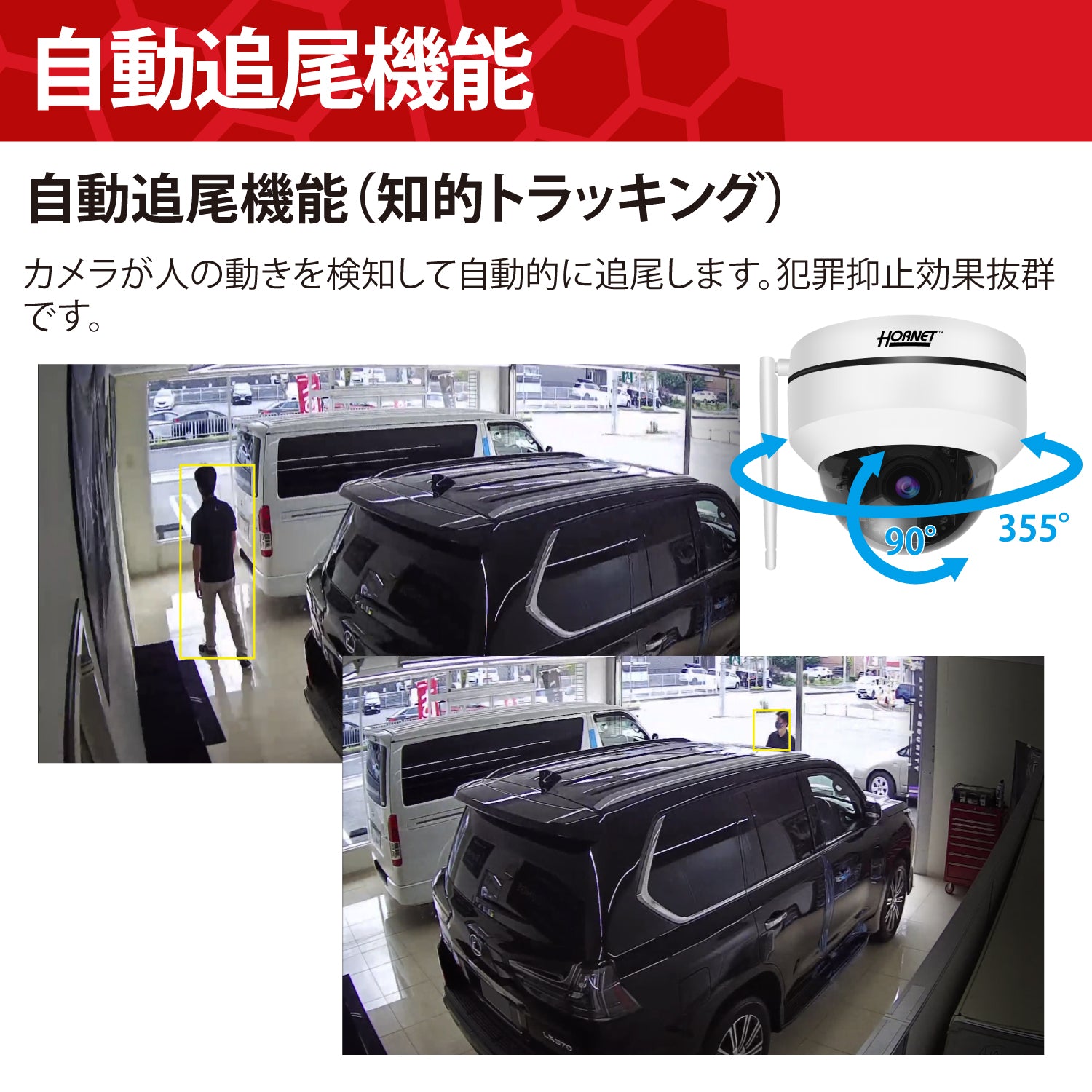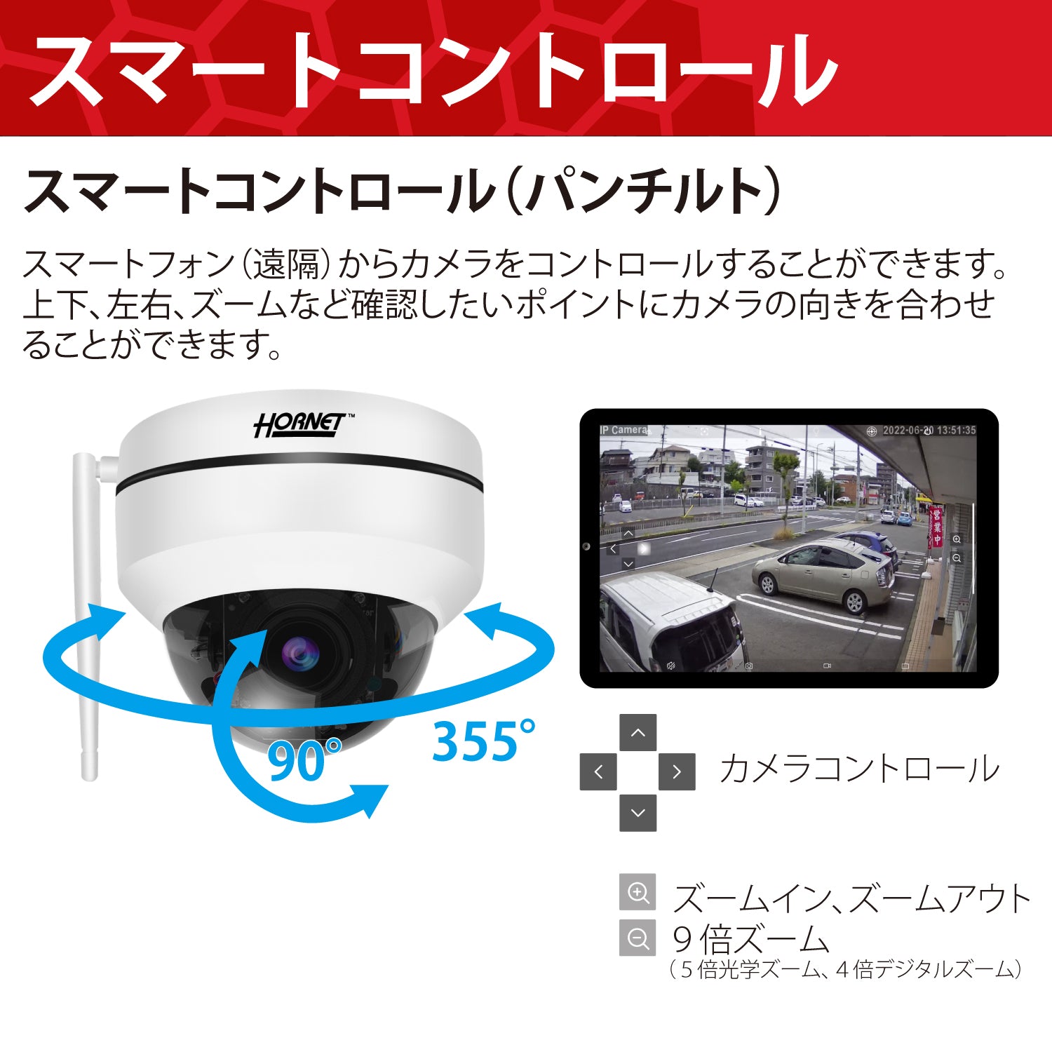 フルハイビジョン(200万画素)で鮮明な映像を記録できます。9倍ズーム(5倍光学ズームと4倍デジタルズーム)を搭載し映像を拡大して詳細な映像を確認することができます。不審者や気になるところのチェックに大変便利です。またカメラを上下・左右にコントロールして周囲の状況を遠隔で確認することができます。AI自動検知、動体検知機能により人の動きを検知すると自動録画すると共にスマートフォンに通知することができます。さらに知的トラッキング(自動追尾)機能によりドーム内のカメラが自動的に人物を追尾し明瞭な映像を記録することができます。防塵防水規格IP66を取得しており、屋外への設置も可能です。