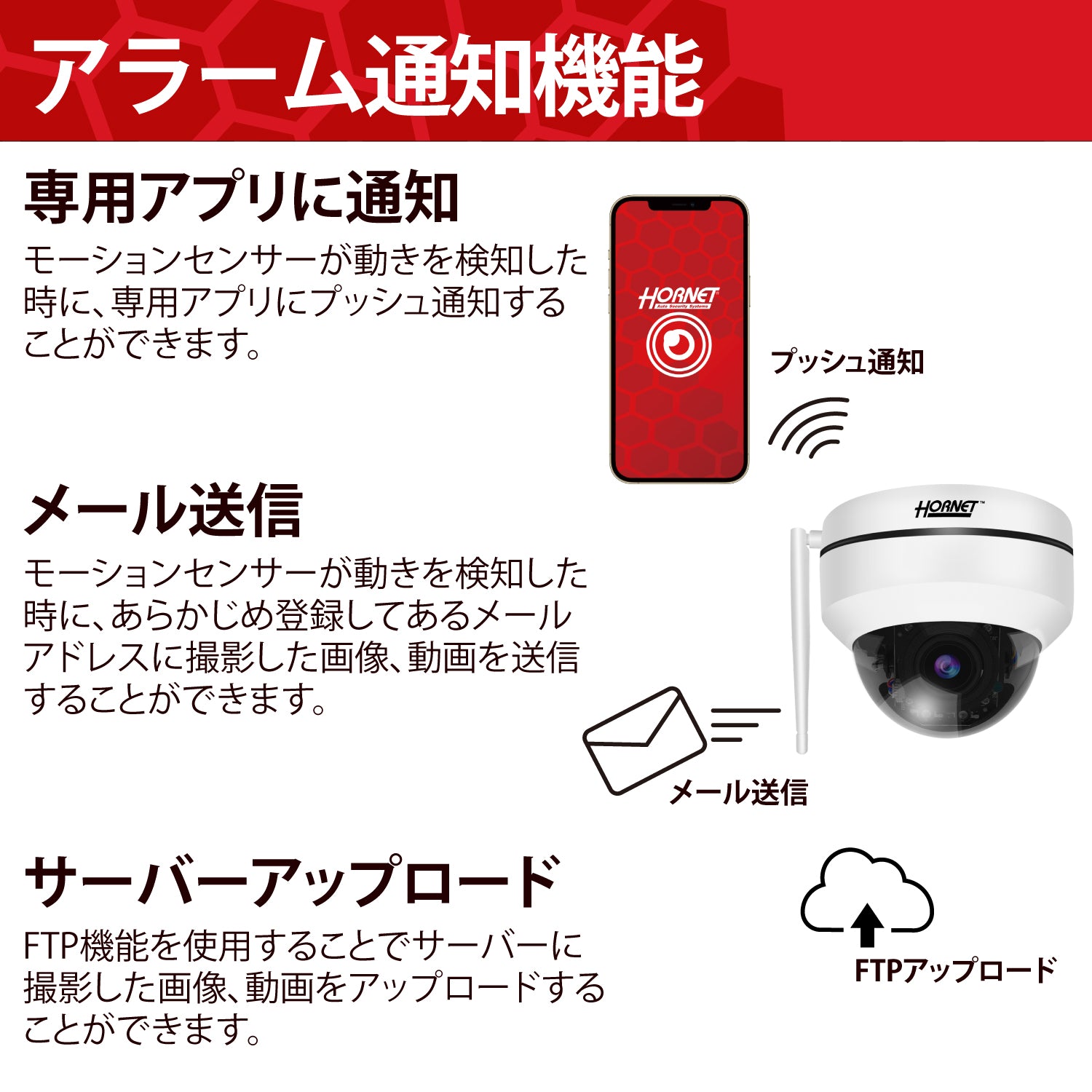 ●本製品のご利用には専用アプリ「HORNET CAM」に対応したOSを搭載したiPhoneもしくはAndroidのスマートフォンが必要です。