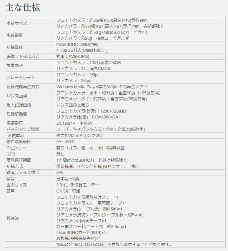 記録方式:常時録画、イベント記録 (Gセンサー、手動)