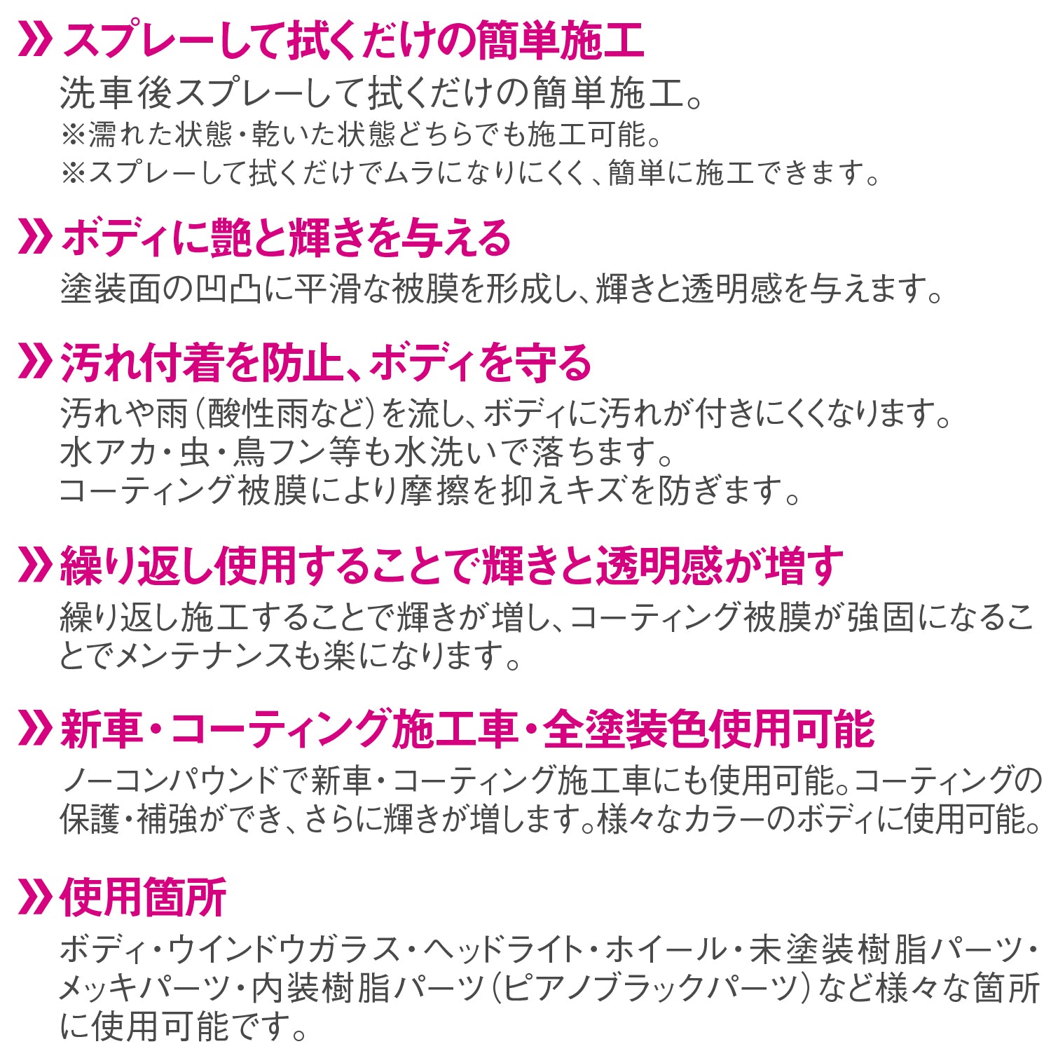 ■スプレーして拭くだけの簡単施工。洗車後スプレーして拭くだけの簡単施工。
